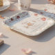 Mark your little one's first birthday with these charming paper plates adorned with a whimsical woodland scene. A gentle fox, a curious bunny, and a tiny hedgehog, all engrossed in books, create a storybook atmosphere. The phrase "Turning the Page to Chapter One" beautifully signifies this milestone. A delicate watercolor floral arrangement frames the design, adding a soft, natural elegance. These plates are ideal for creating a sweet and memorable celebration for your baby's special day.
