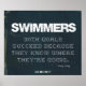A motivational swimming poster, of ripped and torn blue denim cloth, with white loose thread and cross-stitch lettering. Poster design and swimming quote by Felicity Luckey of Great Minds Think Fit™.