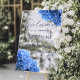 Mariage bleu hydrangea fleurs bienvenue acrylique signe. Grande taille 20 x 30 pouces - avec d'autres options de taille - ce panneau est complètement transparent avec du texte bleu foncé. Des images florales réalistes ornent les coins inférieur et supérieur. Les noms sont en majuscules, police imprimée avec le jour du mariage en dessous. Se tenir debout, sur un chevalet, ou d'une autre façon, devant une église ou un lieu pour accueillir les invités.