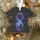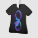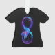 Glowing, purple infinity symbole with flying, luminous, blue hummingbird on black background. Néon.