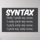 Eine lustige Typografie-Illustration mit der Wortsyntax und dann einigen Sätzen, die erklären, wie wichtig die Platzierung von Wörtern ist, wenn man schreibt. Das lustige Design ist, sich die Nase zu pflücken. Das Wort wird nur in verschiedene Positionen des Satzes verschoben, um ihm eine andere Bedeutung zu verleihen. Ich picke mir nur die Nase. Dies ist ein Design, das für jeden geeignet wäre, der die englische Sprache lernt oder unterrichtet.