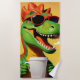 Cooler T-Rex Dinosaurier mit Sonnenbrille und einer entspannenden Tasse Kaffee in einem tropischen Ambiente