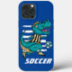 Dieses Design ist ein cooler Telefonkasten für Fußballspieler und Fans. Es hat einen hellblauen Hintergrund mit einem farbenfrohen T-Rex-Dinosaurier in aquamarinem Grün, mit einem gelb-schwarzen Schiedsrichter gestreiftem Shirt, das einen Fußball kickt. Es gibt auch eine Textvorlage, die mit dem Namen eines Untergeordneten oder einem anderen gewünschten Text personalisiert werden soll.