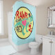 Ein Duschvorhang mit einem grünen T-Rex-Bild, der einen schwarzen Top-Hut mit Herzen trägt. Im Text steht "Rawr" bedeutet, dass ich dich in t-rex Liebe.