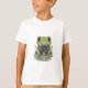 Capture a moment of pure charm with this delightful artwork featuring a tiny, enthusiastic nature photographer. The illustration centers on a bright green, wide-eyed frog standing proudly on a small island patch. Dressed in cute blue shorts, this amphibian shutterbug grips a detailed, retro-style silver and brown camera with both hands, ready to take the perfect shot. The serene pond setting includes floating lily pads, a blooming pink lotus flower, and tall cattails swaying in the background, all rendered in a vibrant, clean cartoon style that highlights the joy of exploration.