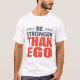 Dieses Design enthält einen motivierend Satz: "SEID STÄRKER ALS EGO", der in fett gedruckter Großbuchstaben dargestellt wird. Die Phrase verwendet kontrastfarbene Farben: "SEIN STRONGER" in dunkelblau und "THAN EGO" in lebhaftem orangefarbenem Rot. Der typografische Stil ist gewagt und robust, mit leicht bedrückender oder Textur in orangefarbenem Text, wodurch ein Vintages oder dynamisches Gefühl entsteht. Horizontale Linien über und unter "BE" geben dem Design ein ausgewogenes Aussehen. Das Gesamtlayout betont Kraft und Entschlossenheit und eignet sich somit für Fitness- oder Selbstverbesserungsthemen-T - Shirt.