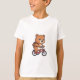 This energetic artwork features a happy brown teddy bear enjoying a ride on a classic red bicycle. The character beams with joy, sporting a wide smile and blushing cheeks while gripping the handlebars. A brown travel backpack is strapped to its back, suggesting a fun adventure ahead. The illustration showcases clean lines and vibrant colors, detailing the bike's frame, pedals, and front headlight, perfectly capturing a moment of playful motion and cuteness.