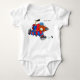 Dieses Bild zeigt ein weißes Baby-Kleidungsstück, das mit einem fröhlichen lila Hippo mit einem gelben Shirt, einer grünen Hose und einer roten Bogen-Krawatte bedruckt ist - und mit einer Hand glücklich winkt. Der Text "Ihr Text" oben legt nahe, dass es sich um ein anpassbares Design handelt. Der freundliche, lebendige Charakter macht es zu einer angenehmen und spielerischen Wahl für personalisierte Babykleidung - ideal zum Geburtstag, Duschen oder zum Alltag.