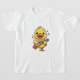 A delightful design featuring a cheerful yellow duckling enthusiastically playing a wooden ukulele. This adorable character is captured in a dynamic pose, standing on one foot while strumming the instrument with a wide, happy smile. Floating musical notes surround the little musician, emphasizing a fun and upbeat atmosphere. The artwork showcases bold outlines, vibrant yellow colors, and a charming expression, making it a heartwarming depiction of a musical performance.