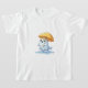 This delightful illustration captures a charming little ghost enjoying a playful stroll through the rain. Clutching a bright, sunny-yellow umbrella that contrasts beautifully with the cool blue tones, the adorable spirit is depicted splashing happily through a water puddle. The character radiates pure joy with a wide, open-mouthed smile, blushing pink cheeks, and a subtle sparkling texture that adds a magical quality to its white form. With water droplets flying and a sense of cheerful movement, this artwork perfectly embodies the wholesome fun of a rainy day adventure.