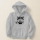 Eine niedliche Cartoon-Katze mit großen, glänzenden Augen schmunzelt auf einer Pizza, die mit Fisch und anderen Zöpfen geschmückt ist. Die spielerische Verwendung von Farben und übertriebenen Features verleiht eine skurrile Touch.