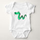 Dieses weiße Baby-Kleidungsstück zeigt eine spielerische, leuchtend grüne Cartoon-Schlange, die in einer gewölbten Pose gekocht ist und mit bunten Polka-Punkten entlang des Körpers verziert ist. Mit einem fröhlichen Ausdruck und flackernder Zunge ist es ein lustiges, auffälliges Design perfekt für Kleine, die sonderbare, lebendige Tiere Lieben.