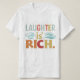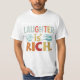 Le design du t-shirt comporte l'expression "Le rire est riche" écrite dans une police audacieuse et ludique au centre. Autour du texte sont des illustrations fantaisistes de visages riants, chacun avec une expression unique, ajoutant au thème joyeux et léger de la conception. Les couleurs sont vives, avec un mélange de tons chauds comme l'orange, le jaune et le rouge, ce qui renforce l'atmosphère joyeuse et positive du design d'ensemble.