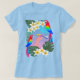 南国の美しい植物と、オウムに囲まれてダーツを構える柄のTシャツです。