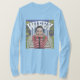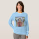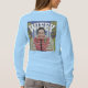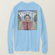T-shirt à manches longues bleu clair Wifey L'oeuvre d'art présente une illustration comique d'une jolie femme aux yeux bleus. Elle est assise sur les marches d'une maison et sourit. Elle porte un pull rayé rouge et blanc et une écharpe verte. L'arrière - plan est un jardin arboré et un ciel bleu. Le mot Wifey est en grandes lettres blanches. L'image est à l'avant et à l'arrière du t-shirt. Vous pouvez modifier l'image à l'aide du bouton Personnaliser.