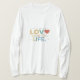 Écrivez une brève description du design du t-shirt pour l'image de "Amour, rire, vie."