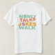 Le t-shirt "Money Talks Jokes Walk" présente un agencement de texte audacieux et multicolore. Les mots sont placés dans une disposition dynamique et ludique, avec des teintes vibrantes qui créent une ambiance amusante et énergique. Le design est visuellement attrayant et attrayant, ce qui en fait un choix parfait pour toute personne qui apprécie l'humour et le style.