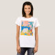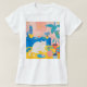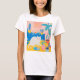 illustration avec un drôle de chat blanc assis sur une table dans une pièce jaune et rose vif. Un T-shirt avec un imprimé joyeux pour une femme aux tons vifs.