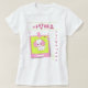 un imprimé pour T-shirts avec un chien mignon dans le style kawaii. Un chien mignon avec des inscriptions en coréen. L'illustration est faite dans les tons rose et jaune dans un style plat.
