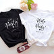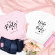 T-shirt de la soirée "The Party" dans un script chic avec un coeur et "Austin, TX" dans une typographie moderne simple. Vous pouvez changer la destination de la fête et la couleur du t-shirt. Un t-shirt coordonné "Femme du Parti" est disponible pour la mariée.
