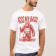 Ce t-shirt blanc présente le texte "KISS MY BASS" en caractères gras et blanc cassé au-dessus d'une illustration de style vintage de Bigfoot debout dans l'eau, tenant une canne de pêche avec un poisson capturé. Le design est humoristique et combine la créature mythique avec un thème de pêche.