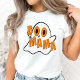 T-shirt fantôme Halloween blanc avec fantôme blanc et texte orange "boo mama". Grande fête d'Halloween / tricoter ou traiter chemise pour les mères.