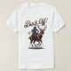 Cette image est ornée d'un t-shirt blanc au design humoristique. Le texte "Buck Off !" s'affiche dans une police stylisée. En dessous du texte, il y a une illustration de dessin animé d'un cowboy à cheval sur un cerf.