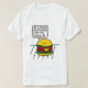 Ce t-shirt est doté d'un hamburger de style caricature avec un visage mignon et des joues roses. Au-dessus du hamburger se trouve une bulle de discours contenant la phrase "DANS UNE RELATION SÉRIEUSE AVEC CE BURGER." Détails : Burger : Représenté dans un style caricatural, avec un visage souriant et rougissant. Le pain est jaune avec des "graines" blanches. Des couches de laitue, de tomate rouge et de fromage sont visibles. Bulle vocale : Rectangulaire, avec un contour noir et un arrière - plan blanc. Le texte est en police noire. À la fin de la phrase est un coeur rouge. Arrière - plan : Le t-shirt lui-même est blanc, avec le hamburger et le texte imprimé dessus. Impression générale : Le t-shirt a un design humoristique qui plairait aux amateurs de hamburger et à ceux qui apprécient les imprimés drôles. L'image et le texte créent un effet comique, mettant l'accent sur un "amour" pour la nourriture.