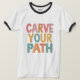 L'image montre un t-shirt multicolore avec le texte "Carve Your Path" dans une variété de couleurs. Le texte est arrangé de manière dynamique et accrocheuse, ce qui suggère l'idée de graver son propre chemin dans la vie.