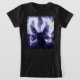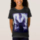 T-shirt avec Innocence Fairy Cat de la faune et de l'artiste imaginaire Michaeline McDonald d'un mignon chat noir aux ailes violettes brillantes contre un arrière - plan étoilé noir.