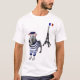 Un mignon chien avec une moustache en chemise rayée bleue et blanche et un béret avec la Tour Eiffel avec le drapeau français en arrière - plan.