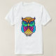Un t-shirt blanc avec un motif de hibou coloré sur le devant. Le hibou est stylisé avec des motifs géométriques et des couleurs vives, dont les tons orange, jaune, vert, bleu et rose. La conception est symétrique et caricaturale, avec les plumes du hibou représentées par des écailles ou des carreaux individuels. Le hibou a de grands yeux bleus ronds et un petit bec pointu. Le style général rappelle un graphique vectoriel ou une illustration numérique.