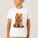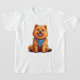 Illustration de style dessin d'un chien moelleux et joyeux. Le chien a un manteau orange vif avec une crinière boisée et une expression conviviale, montrant un large et heureux sourire. Ses yeux sont grands et expressifs, contribuant à son comportement ludique. Le chien est assis confortablement, avec ses pattes devant, et il porte un bandana bleu orné de motifs de fleurs blanches autour du cou. L'ambiance générale de l'illustration est mignonne et invitante, ce qui en fait une représentation émouvante d'un chien. L'arrière - plan est blanc clair, mettant l'accent sur les couleurs vives du chien.