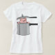 Un cochon dans une casserole levant la tête. Ce design semble vraiment efficace sur ce T-shirt féminin