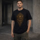 Designed specifically for fabric, the coin is tightly cropped and vertically weighted, with a restrained ash-and-dust falloff that keeps the mark grounded on the shirt instead of floating. The aged brass tones and ink-dark relief give the impression of something stamped, not printed—claimed rather than displayed.