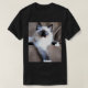 Un design épuré de T-shirts avec un chat siamois ludique aux yeux bleus percevants, entouré de motifs géométriques minimalistes et de couleurs pastel douces, mettant l'accent sur l'élégance, le charme et la grâce féline.