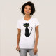 Un chat noir aux yeux verts assis droit. Ce design semble vraiment efficace sur ce T-shirt féminin