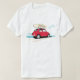 T-shirt exclusif de Geetees montrant Fiat classique iconique 500 en rouge avec des panneaux de surf se dirigeant pour la plage. Ce T-shirt original de cinquecento est le cadeau parfait pour n'importe quel enthousiaste classique de voiture