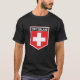 Die Nationalflagge der Schweiz ist in eine Schildform eingegossen, die auch das Set des Landesnamens über der Fahne hat.
