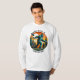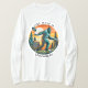 Bigfoot est légendaire. Sasquatch rétro jetant le golf à disque avec un coucher de soleil vintage et des pins derrière lui.