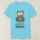 Le tee - shirt présente une illustration originale d'un hibou de dessin animé bleu et marron, avec GIVE A HOOT dans une police amusante.