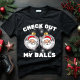Répandez une bonne fête avec notre t-shirt de Noël Funny Check Out My Balls ! Ce design cool noir et blanc présente une citation hilarante qui est parfaite pour la saison festive. Préparez-vous à faire le tour du sapin de Noël avec le Père Noël et un brin d'humour.