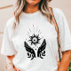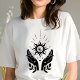 Offrez-vous l'énergie céleste avec cette chemise d'inspiration boho, qui a les mains en tendant vers un soleil radiant et une lune en croissant. Le design minimaliste est orné d'accents feutrés et de détails cosmiques, créant une puissante déclaration visuelle. Parfait pour ceux qui aiment l'esthétique boho et le symbolisme spirituel, cette chemise combine la nature, le cosmos, et un sens de l'autonomisation. Les couleurs noir et blanc rendent l'ensemble polyvalent pour n'importe quelle armoire, tandis que le design saisissant ajoute un élément de mystère et de profondeur. Portez cette chemise pour canaliser les vibrations positives et l'énergie céleste partout où vous allez.