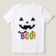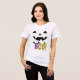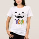 Un t-shirt blanc avec un design d'Halloween ludique et festif. Au centre se trouve un sourire orange jack-o’-lanterne avec des triangles noirs découpés pour les yeux et le nez. Ci-dessous se trouve le mot "BOO !" en grandes lettres ; chaque personnage décoré de façon unique pour représenter différents symboles d'Halloween : une aile de chauve-souris pour "B", des visages fantômes éffrayants pour "O", et un motif citrouille orange remplissant un autre "O". Le design saisit l'essence du plaisir d'Halloween et pourrait être porté dans le cadre d'une tenue de vacances décontractée ou dans un costume simple.