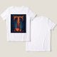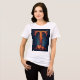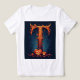 This is a festive, spooky illustration featuring an ornate, glowing orange letter 'T' that looks like an ancient, horned pillar, decorated with autumn leaves and vines. It is centered above two glowing, grinning jack-o'-lanterns nestled in a pile of fallen leaves against a dark, hazy teal background.