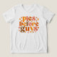 Ce design amusant et décalé à thème de chute comprend l'expression ludique "Pies avant les gars" dans une police audacieuse et d'inspiration rétro. Le texte est disposé dans une mise en page compacte et empilée avec chaque mot dans un style de police différent, créant une composition dynamique et attrayante. La palette de couleurs comprend des teintes automnales chaudes comme des oranges profondes, des marrons riches et des jaunes dorés, capturant parfaitement les ambiances douillettes de la saison.