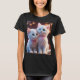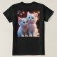 Un T-shirt pour femmes dans un tissu doux et de haute qualité, avec une couleur noire élégante comme base. La pièce maîtresse du design est un adorable chaton noir aux yeux expressifs, positionné sur le devant. Le chaton a un manteau élégant et brillant, se mélangeant subtilement à l'arrière - plan noir de la chemise, tout en se démarquant avec ses yeux brillants et ses whiskys délicats. Le T-shirt a un col d'équipage classique et des manches courtes, offrant un ajustement confortable et flatteur. Le design est à la fois ludique et élégant, ce qui en fait une pièce polyvalente pour des tenues décontractées ou légèrement dressées.