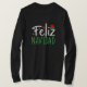 Get into the holiday spirit with this fun and festive "Feliz Navidad" long sleeve t-shirt! Perfect for the cold weather, this design features the Spanish greeting for "Merry Christmas" in a cheerful, mixed font. "Feliz" is written in white script with a little Santa hat on top, while "Navidad" pops in bold green text. The design is accented with small red and green stars, making it the perfect piece of apparel for Christmas parties, caroling, or simply celebrating the winter season. The long-sleeve style is great for keeping warm, and the simple black background lets the classic holiday colors really stand out. It makes a great gift or a wonderful outfit for family holiday photos!
