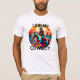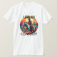 Un cow-boy monte à cheval avec un skyline de ville dans l'arrière - plan.