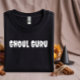 T-shirt d'Halloween avec typographie blanche et la phrase humoristique "Ghoul Guru." Ce T-shirt incorpore les mots "Ghoul Guru" dans une police blanche, destinée à l'usure pendant les fêtes d'Halloween. L'expression est censée être une prise ironique des propos de gourous typiques.